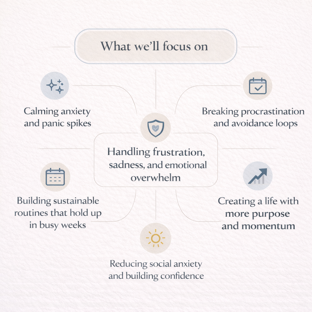 I work with adults dealing with anxiety, panic symptoms, focus and follow-through issues, and screen habits that have started to feel hard to control.