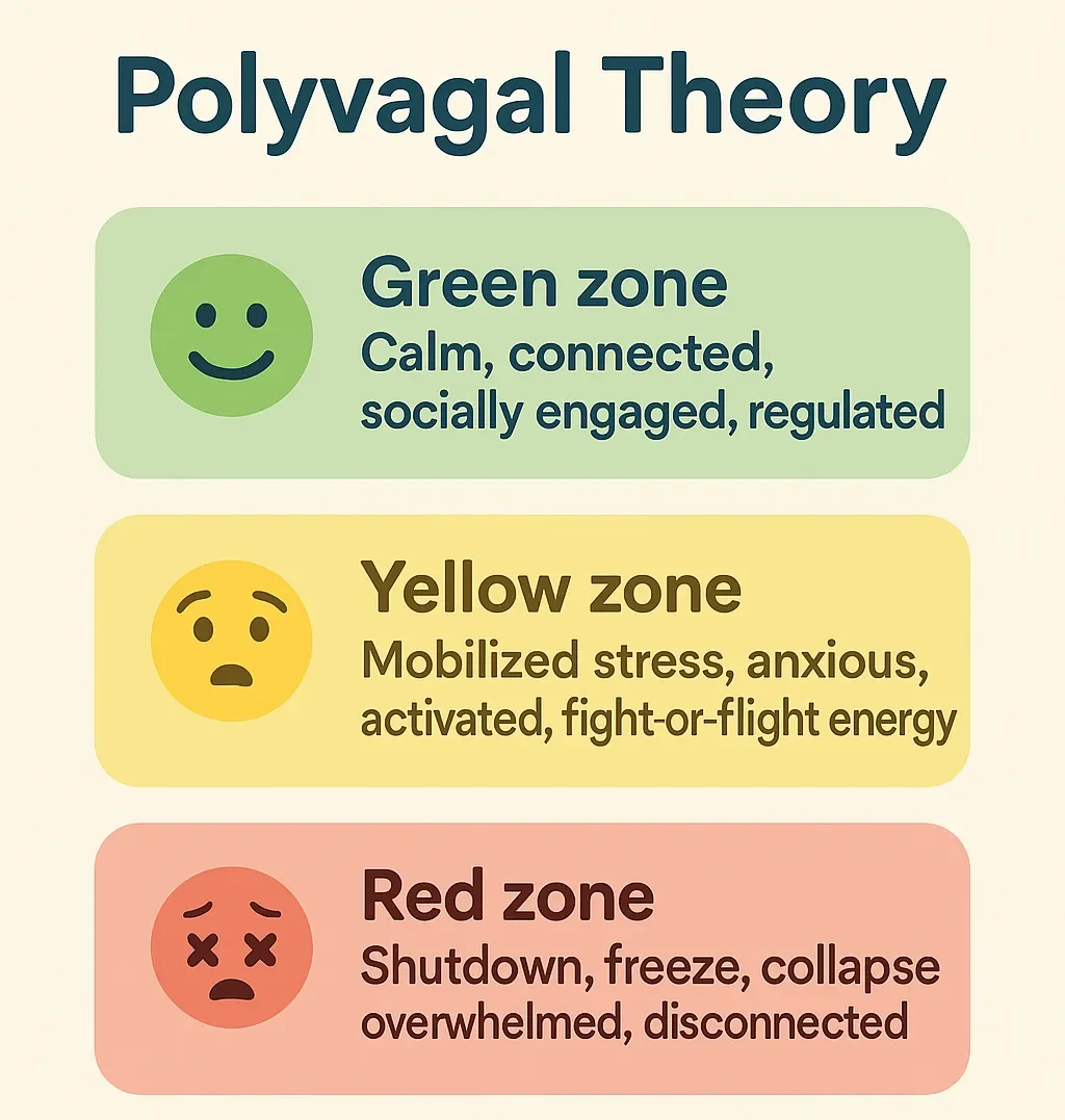 Polyvagal theory explains why your body shifts between different states depending on how safe or overwhelmed you feel. When stress builds, you move toward yellow. When things feel too heavy, your system can drop into red.
