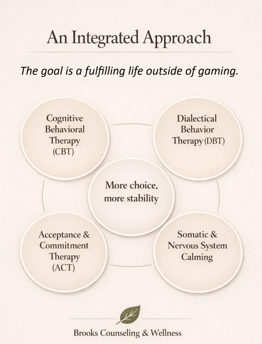 DBT was designed to build emotion regulation, distress tolerance, and behavioral control skills, especially when emotions run high. Those skills can be directly relevant when gaming is being used as an escape from overwhelm or intense mood states.