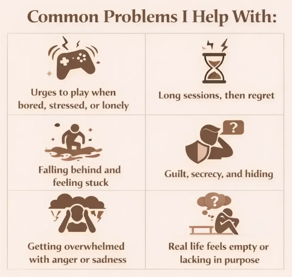 Some people want to quit entirely. Others want to just reduce gaming and regain balance. I support people with both goals, whether you feel addicted or just stuck in a habit that no longer feels healthy.