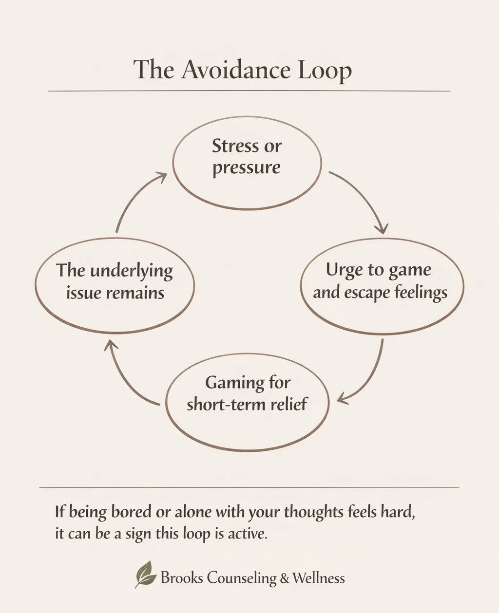 That’s very common. Therapy can help you build more ways to feel grounded and connected, so gaming isn’t the only place that feels good.