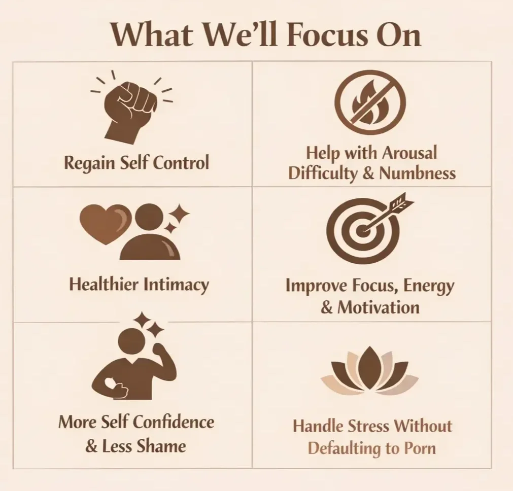 Small weekly experiments and routine changes so progress continues outside the therapy room.Self improvement, not just “stop watching porn”