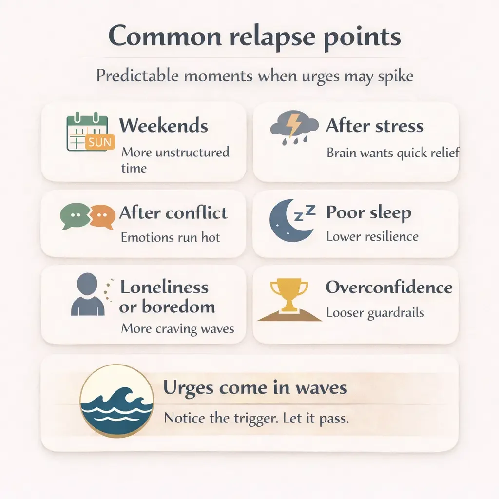 We look at the conditions that make urges stronger: sleep, stress, loneliness, boredom, and unstructured time. This helps us predict when your brain is most likely to default to porn.Pattern and Payoff Map